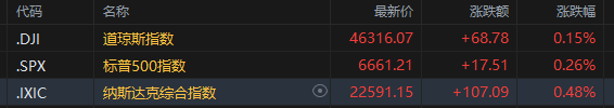 截至收盘,道琼斯指数涨0.15%,报46316.07点;标普500指数涨0.26%,报6661.21点;纳斯达克综合指数涨0.48%,报22591.15点。