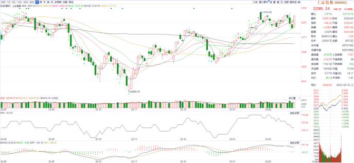 今天,大盘全天震荡走高,沪指涨超2%。上证50大涨2.73%,其成分股全线上涨,三一重工、中金公司、中国建筑等涨超5%。上证50成分股的大涨也带动金融、基建、有色等权重板块集体走高,湘财股份、徐工机械、天山铝业等涨停。ChatGPT概念相关板块午后再度走强,三六零、新华网、神州数码等涨停。三大通信运营商集体走高,中国电信涨停,中国联通涨超7%。家居家电股表现活跃,好太太、老板电器、索菲亚、金牌橱柜等涨停。下跌方面,医药股集体调整,新冠药方向领跌,多股跌超3%。总体上两市个股涨多跌少,超3800股上涨,赚钱效应大幅回暖。