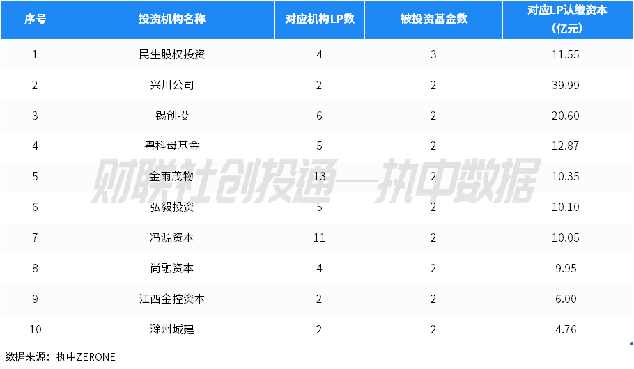 3月受LP青睐的投资机构TOP10如下表所示(按期内对应被投基金数统计,被投基金数相同的以对应LP认缴资本排序):