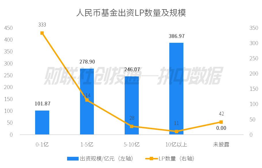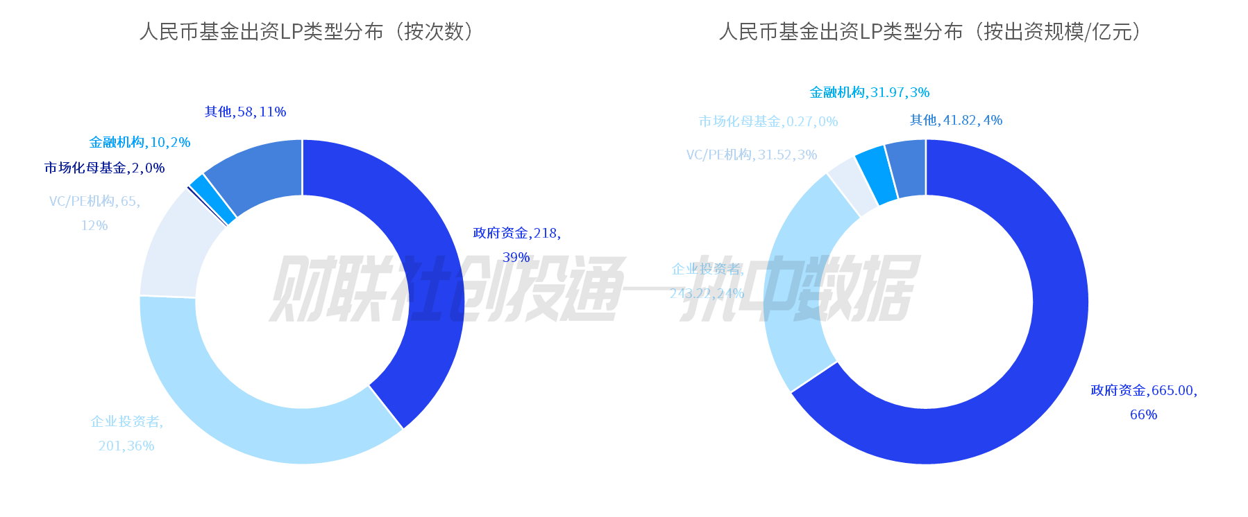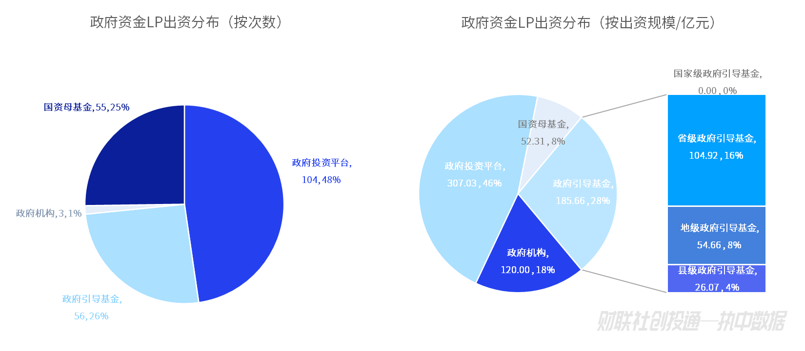 从出资规模来看,政府资金继续保持首位,认缴资本约665亿元,占比66%;企业投资者位居第二,认缴出资约243亿元,占比24%。进一步分析LP的资金属性,政府及国资控股的机构LP出资额占比达89%。