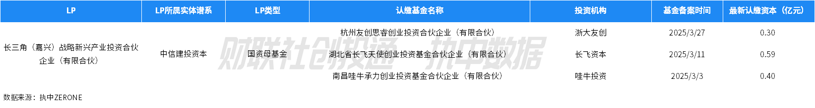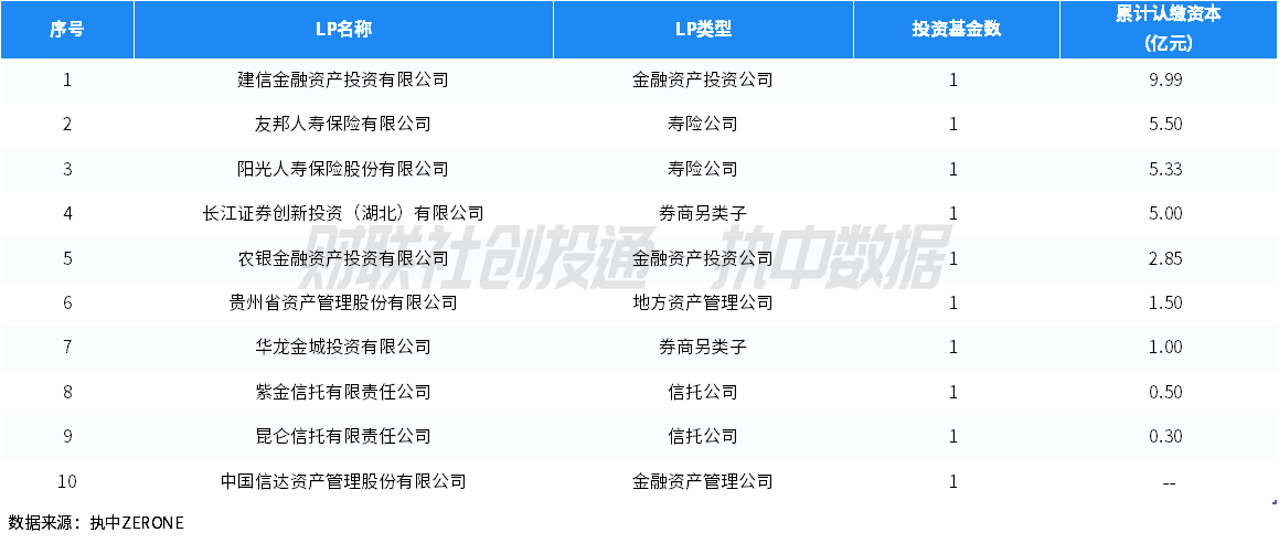 3月金融机构LP中,建信投资出资额最高,认缴资本9.99亿元,出资了备案基金广州产投建源股权投资合伙企业(有限合伙)。友邦人寿、阳光人寿、长江证券创新投资(湖北)有限公司出资额也均在5亿元及以上。