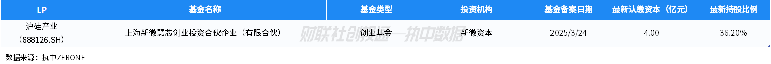 其中,沪硅产业(688126.SH)出资了上海新微慧芯创业投资合伙企业(有限合伙),认缴资本4亿元,为3月出资最高的上市公司LP。