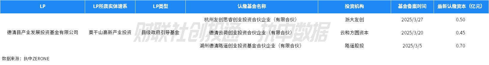 3月最活跃的政府资金LP为德清县产业发展投资基金有限公司和长三角(嘉兴)战略新兴产业投资合伙企业(有限合伙),各出资参与3支备案基金,累计认缴资本分别为1.65亿元和1.29亿元。