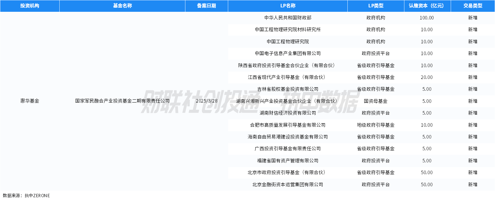 3月最受政府资金LP青睐的投资机构为惠华基金,其管理的国家军民融合产业投资基金二期,于3月28日完成中基协备案,注册资本596亿元,出资股东共计27家,其中有15家政府资金LP出资,对应认缴资本300亿元。