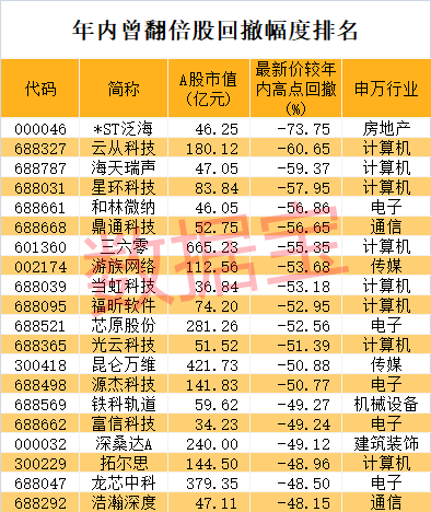 数据宝统计,不含今年上市的次新股,今年以来最大涨幅曾翻倍的股票中,最新收盘价较年内高点平均回撤30.61%。14只股票回撤幅度超50%,包括*ST泛海、云从科技、海天瑞声、星环科技、和林微纳等。