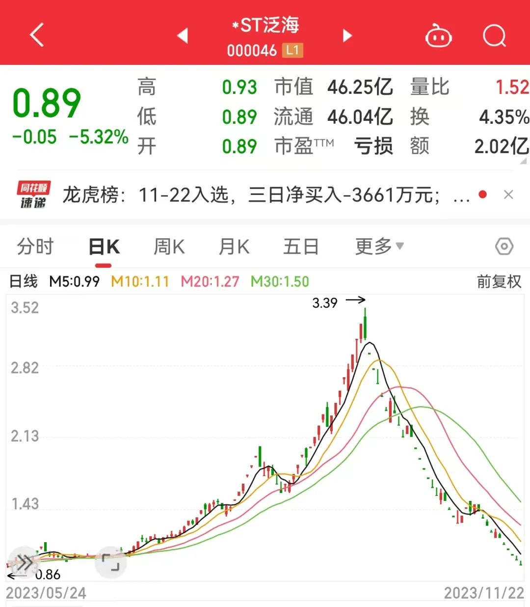 11月22日,*ST泛海再次跌停,这是该股连续第6个跌停板,最新收盘价连续3个交易日不足1元,A股市值跌破50亿元。