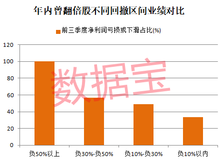 整体对比来看,高回撤的公司普遍业绩欠佳。数据宝以年内最大涨幅翻倍的股票为样本,统计发现,最新价较年内高点回撤50%以上的股票中,今年前三季度净利润同比下滑或亏损的占比达到100%;回撤区间在30%至50%之间的股票,今年前三季度净利润同比下滑或亏损的占比为56.76%;回撤区间10%以内的股票,今年前三季度净利润同比下滑或亏损的占比最低,仅33.33%。