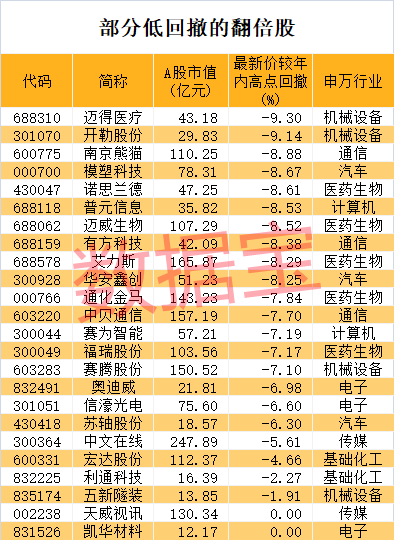 年内曾翻倍股,回撤幅度不足10%的股票仅24只,其中凯华材料、天威视讯均于今日创下年内新高。