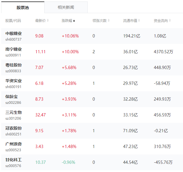 今日(5月22日),白糖概念股表现活跃,截至收盘,糖业龙头股中粮糖业、南宁糖业双双涨停,其中,南宁糖业获9万手近1亿元资金封单。此外,粤桂股份、华资实业涨幅均超5%,保龄宝、三元生物、冠农股份等股也涨幅居前。