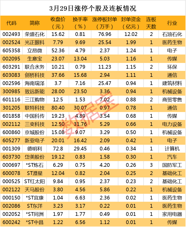 从收盘涨停封单来看,荣盛石化封单量最高,有76.96万手;其次是光正眼科、海南瑞泽,涨停板封单分别为25.54万手、25.47万手。
