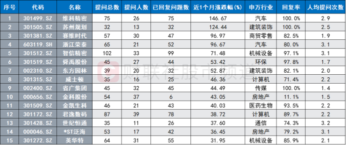 从这些个股的近期股价表现来看,不少高频提问股也录得了亮眼的涨幅,筛选近1个月以来累计上涨超30%且投资者提问总数超30次的个股名单,其中,维科精密、苏州规划、赛维时代、浙江荣泰、智信精密等股涨幅较大。若不计算今年7月以来上市新股,东方园林、威士顿、省广集团、金科股份、世纪恒通等股涨幅较高,其主要涵盖房地产、建筑装饰、传媒、通信、计算机板块。