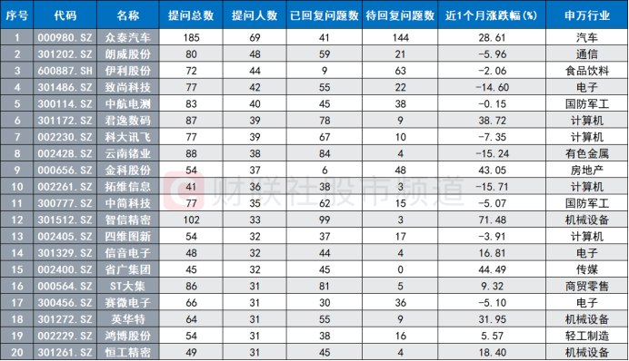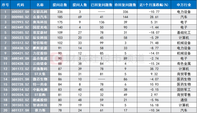 具体个股方面,安彩高科近1个月以来累计共获336次提问,投资者提问热度位居首位,众泰汽车、奥海科技、国星光电、双星新材、辰安科技、智信精密6股的提问次数也均在100次以上。而若以提问人数来筛选,众泰汽车则成为投资者近期重点关注的个股标的,此外,朗威股份、伊利股份、致尚科技、中航电测等股也倍受市场关注,其提问人数也均超40人。