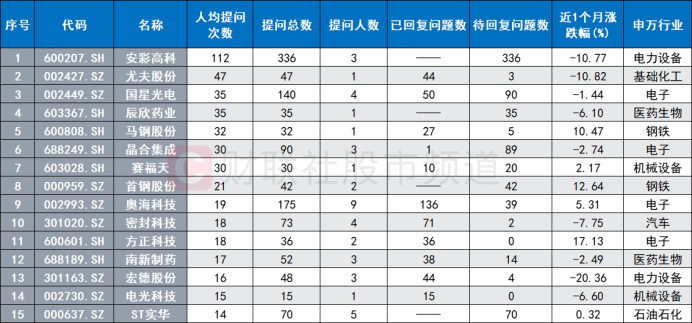 注:近1个月人均提问次数居前的个股(问答相关数据:截至8月7日;涨跌幅数据:截至8月8日收盘)