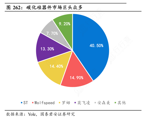 碳化硅器件方面,国泰君安证券分析师王聪等2022年11月16日发布的研报指出,海外巨头模式多样,垄断全球碳化硅器件市场。根据Yole数据,2020年全球碳化硅功率器件市场份额中,ST为40.5%,Wolfspeed为14.9%,罗姆为14.4%,英飞凌为13.3%,安森美为7.7%。