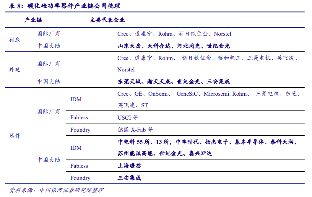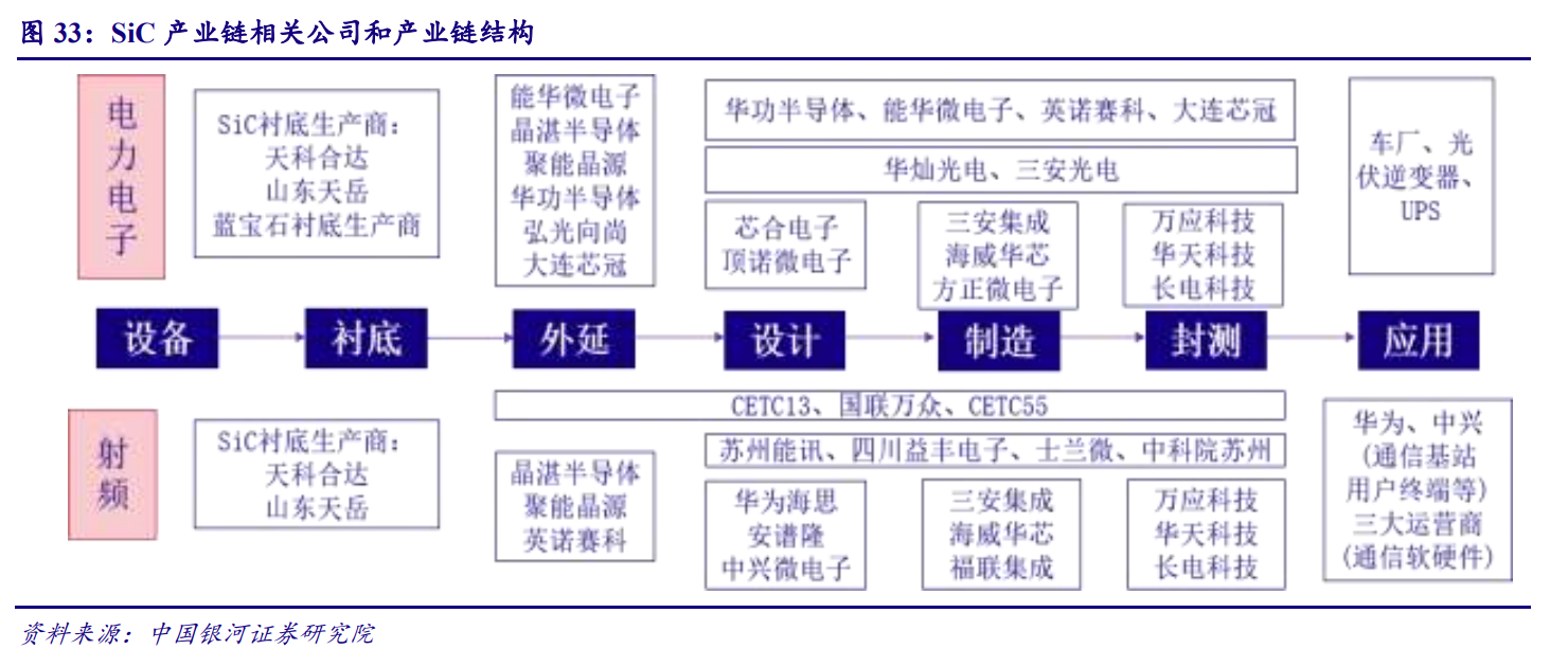 中国银河证券分析师高峰等12月13日发布的研报指出,从产业链层面初步划分,整个SiC产业链主要分为设备、衬底、外延、设计、器件和封装模块,国内多数厂家仅从事产业链部分环节,例如天岳先进专注衬底材料的演进,东莞天域和瀚天天成对外延部分研究比较深入,国内多家功率器件企业如三安光电、士兰微等已入局SiC赛道。