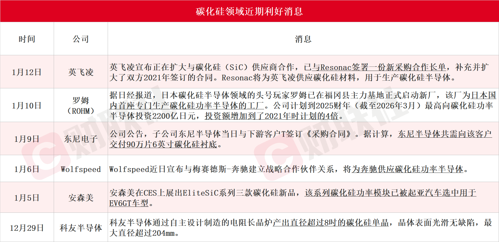 碳化硅领域近期利好消息不断,据财联社不完全统计,包括本周一至周三拿下三连板的东尼电子签大单三年交付量剑指90万片和芯片大厂英飞凌扩大碳化硅材料采购等;具体汇总如下表。