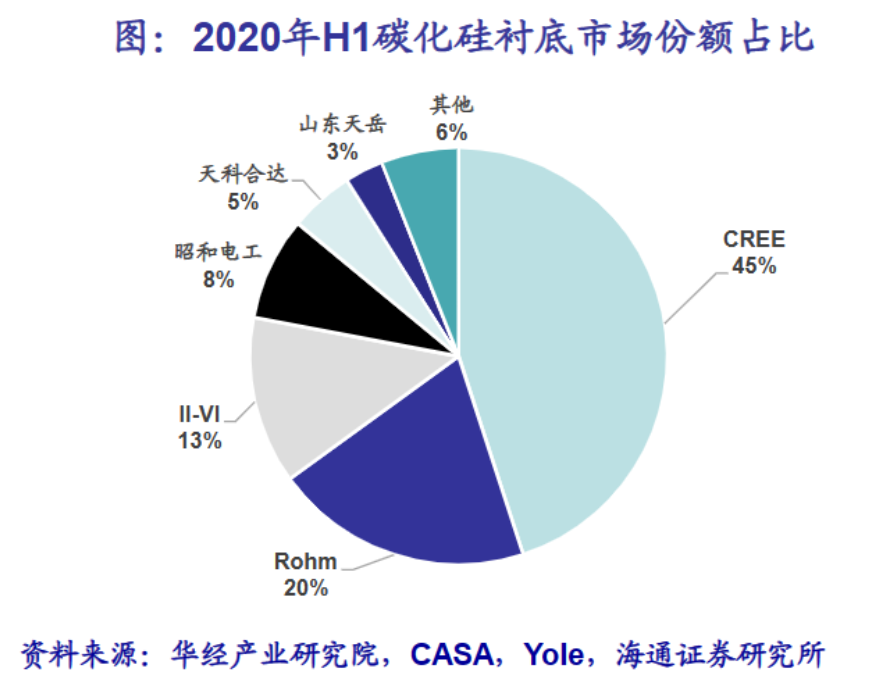 根据华经产业研究院援引Yole数据,2020年上半年,碳化硅衬底市场(半绝缘和导电型)Wolfspeed市占率达到45%以上,国内龙头天科合达和天岳先进的合计市场份额不到10%。天岳先进、烁科晶体(中电科孵化)、河北同光(中科院半导体所孵化)现有主要产品为高纯半绝缘衬底,而天科合达(中科院物理所孵化)、世纪金光主要产品为导电型衬底。