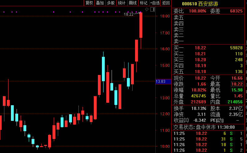 旅游股早盘再度走强,板块指数盘中一度大涨近4%,创阶段性新高,并逼近年内最高点。西安旅游连续第3日涨停,创3年半多来新高,11月以来,西安旅游多次出现连续涨停现象;大连圣亚亦强势涨停,丽江股份、桂林旅游等涨幅居前。