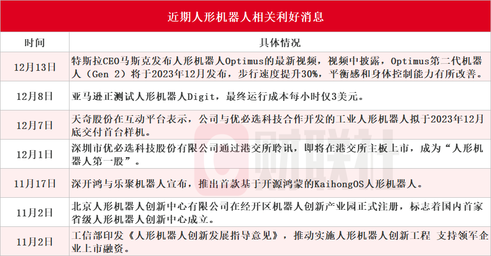 人形机器人催化剂不断,特斯拉CEO马斯克周三发布人形机器人Optimus的最新视频。而“人形机器人第一股”优必选于12月1日通过港交所聆讯。据财联社不完全梳理,近一个多月人形机器人利好消息汇总如下图: