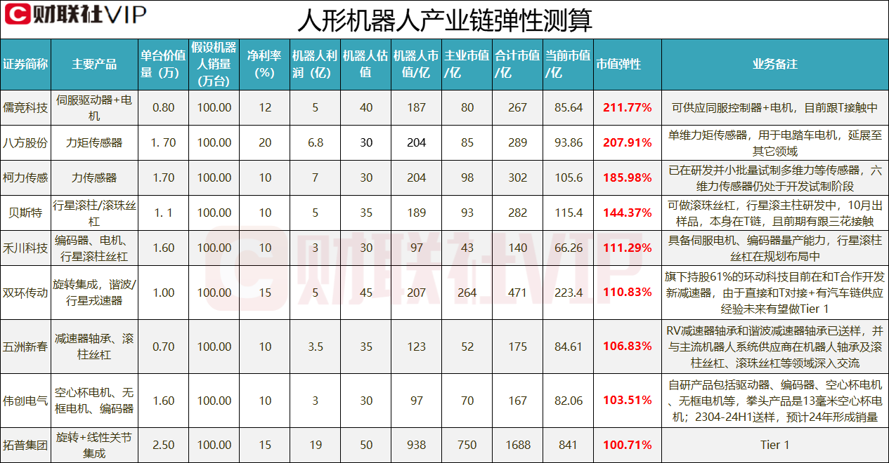 据财联社VIP盘中宝•数据栏目此前梳理,以假设100万台人形机器人销售量计算,2家A股产业链上市公司市值弹性超200%,分别是儒竞科技和八方股份。此外还有7家上市公司市值弹性超100%,包括柯力传感、贝斯特、禾川科技、双环传动、五洲新春、伟创电气、拓普集团。其主要产品、单台价值量、净利率、机器人利润、机器人估值、市值弹性等情况如下图所示: