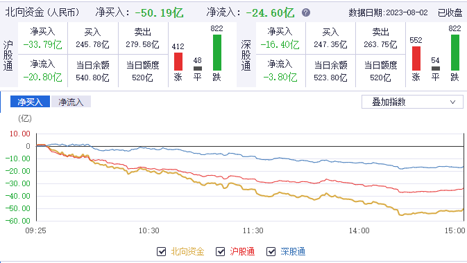盘面上,超导概念、复合集流体、房地产、减速器等板块涨幅居前,旅游、CRO、煤炭、银行等板块跌幅居前。同时,沪深两市总成交额8361亿,较上个交易日缩量1206亿。而北上资金,则在今日净卖出50.19亿,开始大幅流出。