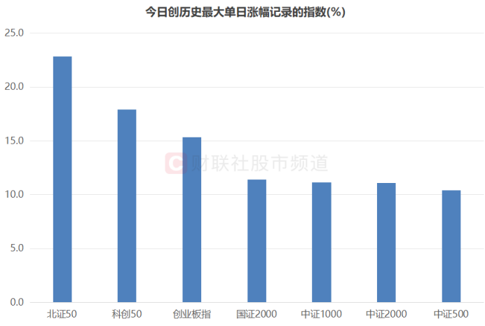 若统计市场今日(9月30日)涨跌幅情况,不少主要指数也集体迎来“奇迹”行情。截至收盘数据,在主要板块类指数中,创业板指、科创50、北证50今日均创历史最大单日涨幅记录,同时,创业板指、科创50、北证50本月也录得历史最大单月涨幅峰值。在主要规模类指数中,今日录得历史最大单日涨幅记录的有中证500、中证1000、国证2000、中证2000。