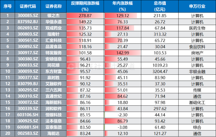 个股方面,同样在此轮反弹期间,不计算新股情况,A股平均上涨近28.6%,中位数涨幅近27.0%。其中,涨幅超50%(包含50%)的个股达194只,整体占比近3.6%,25股同期收跌,占比仅为0.47%。具体标的来看,银之杰表现最为活跃,涨幅达2.8倍,华信永道、双成药业、指南针、汇金科技、品渥食品、特发服务股价也获翻倍上涨,安硕信息、同花顺、东方财富等股也涨幅居前。