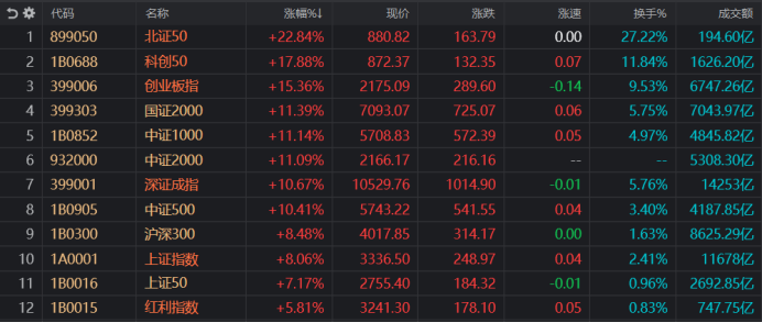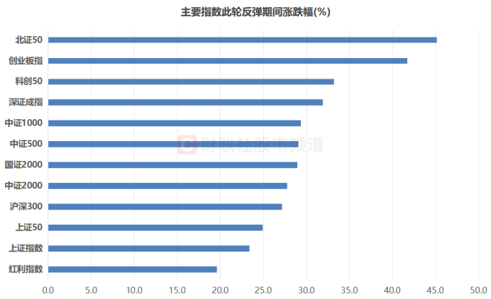复盘此轮市场反弹,以沪指拉升前夕低点(2689.7点)起始统计,至今仅历经9个交易日,期间,沪指爆拉超600点,累计上涨超23%,受行情陡升提振,其年内涨幅也重新转正,收涨近12.1%。其余市场主要指数同期也修复明显,其中,此前深跌的北证50、创业板指表现尤其活跃,分别达45.2%、41.7%,科创50、深证成指、中证1000等指数也相对涨幅居前。