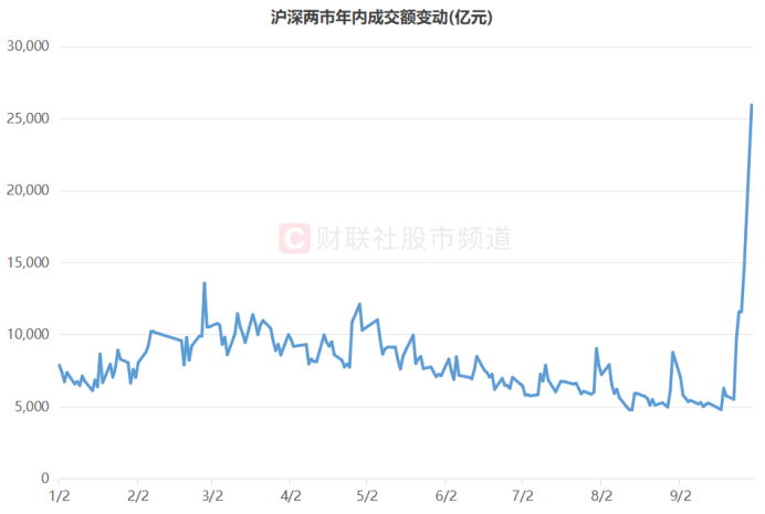 作为9月最后一个交易日,各大指数均以暴涨“收官”。从成交额数据上看,沪深两市今日量能再度释放,全天成交额达2.59万亿元,创出历史成交金额记录。值得注意的是,其今日录得万亿成交仅用时仅35分钟,同样创历史最快万亿纪录。受市场整体量能爆发影响,创业板、科创板今日也双双创历史新高,同时,北交所今日成交额也录得今年1月2日以来高点。