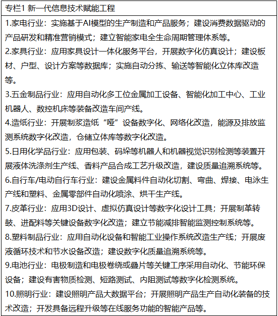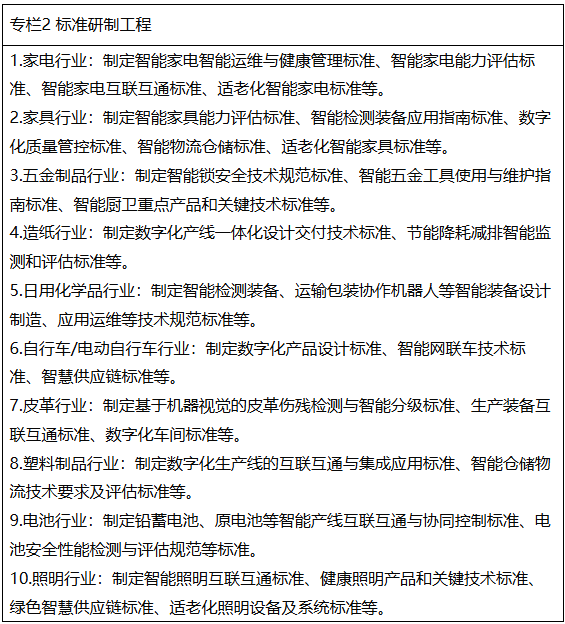 1.推动高端化跃升。深化物联感知、智能控制、人机交互等技术在家电、家具、照明、手表等终端消费品的应用,推动智能产品跨品牌互联互通。围绕老人、儿童等重点人群,研究开发适老化智能家居、生活服务类机器人等智能产品。鼓励家电、家具、皮革、五金制品等数字化基础好的产业园区,加快5G、工业互联网、数据中心等新型基础设施布局和规模化应用,推动园区内配套企业间数据可信共享,打造高水平数字化园区。