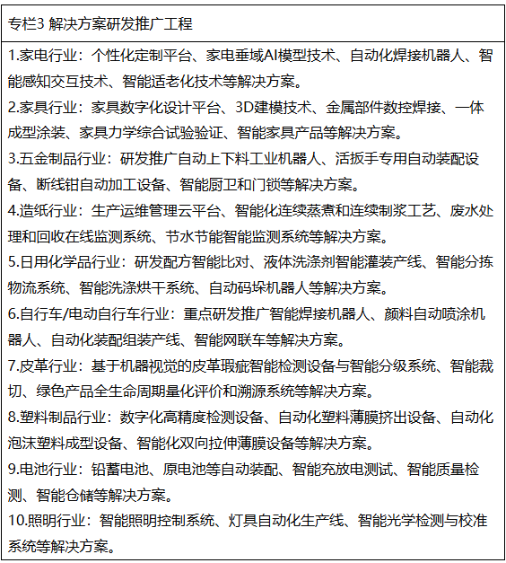 5.壮大服务队伍。依托智能制造系统解决方案揭榜挂帅、供应商能力评估等工作机制,遴选发布一批优质数字化转型供应商。面向家电、家具、五金等离散型轻工业研发推广智能排产、自动化装配组装、智能仓储等解决方案。面向造纸、日用化学品等流程型轻工业研发推广智能配方设计、质量在线监测、设备预防性维护等解决方案。面向中小企业研发推广一批“小快轻准”的解决方案。