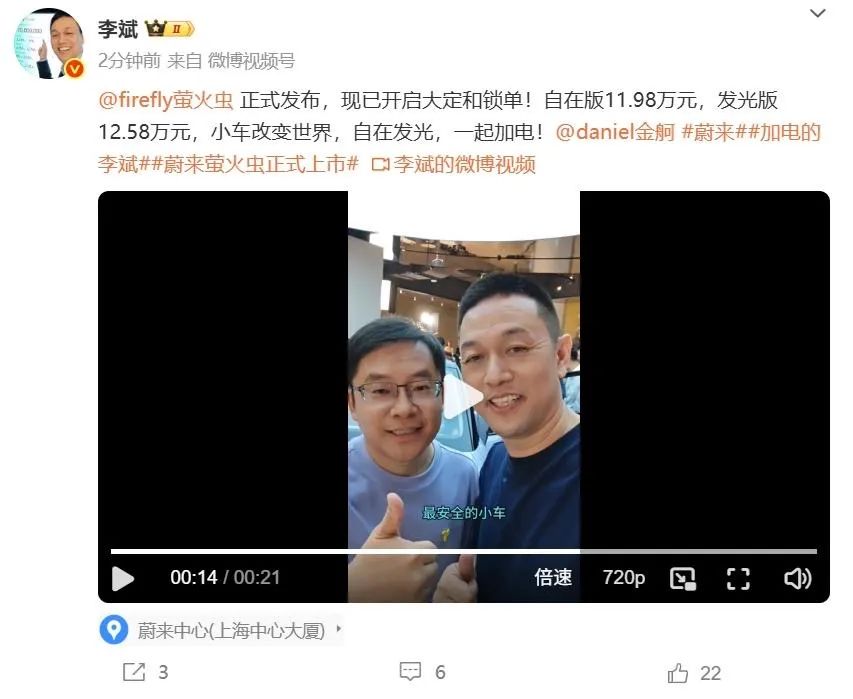 4月19日,蔚来创始人、董事长、CEO李斌在微博发文:“@firefly萤火虫 正式发布,现已开启大定和锁单!自在版11.98万元,发光版12.58万元,小车改变世界,自在发光,一起加电!”