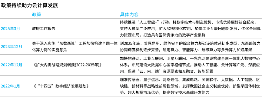云计算作为新基建中大数据中心、人工智能、工业互联网的基础架构,是国家重点投资和建设的方向。近年来,中国政府高度重视云计算行业的发展,出台了一系列政策措施支持云计算及相关产业的发展。2025年两会上,政府工作报告就提出持续推进“人工智能+”行动,将数字技术与制造优势、市场优势更好结合起来,支持大模型广泛应用。这些措施都有望进一步提升对算力的需求,加速云计算行业的发展。