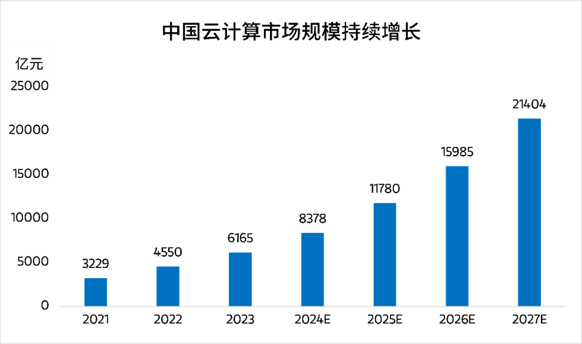 在上述因素的共同推动下,中国云计算市场近年来保持快速发展态势。中国信通院发布的报告显示,2021年至2023年,中国云计算规模复合增长38%,预计到2027年我国云计算市场规模将超过2.1万亿元。