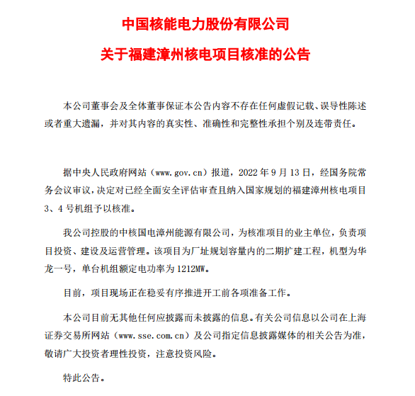 消息面上,9月13日召开的国务院常务会议指出,为提升能源保障能力和促进绿色发展,会议决定,核准已列入规划、条件成熟的福建漳州二期、广东廉江一期核电项目。强化全过程监管,确保安全万无一失。
