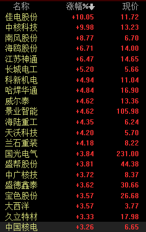 9月15日,核电板块开盘活跃,截至发稿,佳电股份、中核科技一字涨停,南风股份、海鸥股份、江苏神通、长城电工、海陆重工、天沃科技等纷纷高开。