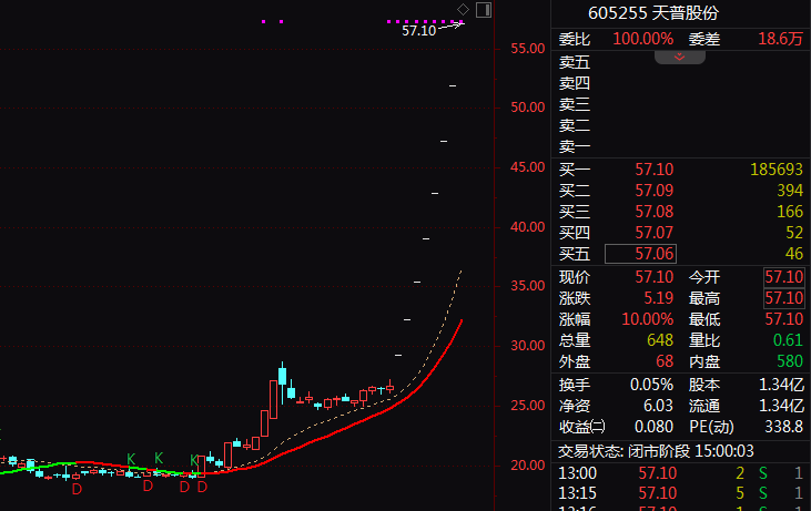 9月2日,天普股份(605255)再度涨停,这已经是该股连续收出的第8个“一”字涨停,连续8个交易日内日收盘价格涨幅偏离值累计达到100%。截至9月2日收盘,天普股份的股价收于57.1元,上涨5.19元,涨幅为10%。
