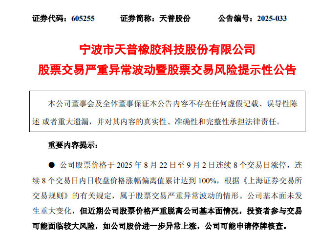 9月2日晚,天普股份发布股票交易严重异常波动暨股票交易风险提示性公告,公司基本面未发生重大变化,但近期公司股票价格严重脱离公司基本面情况,投资者参与交易可能面临较大风险,如公司股价进一步异常上涨,公司可能申请停牌核查。