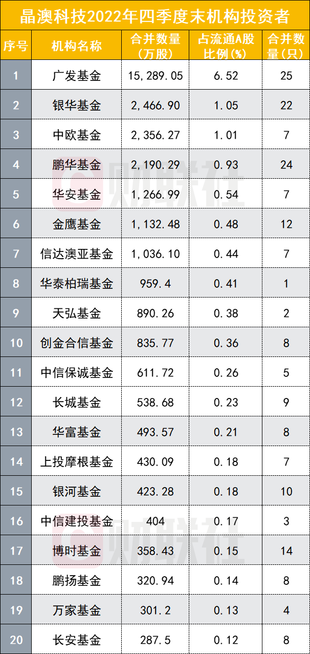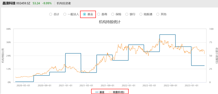 根据2022年四季报,截至2022年底,共有76家基金公司旗下产品重仓晶澳科技,合计持股数达到了3.51亿股,占其流通股比例合计为14.98%,较2022年三季度末的32.04%、2022年二季度末的42.88%(季报不公布全部持仓,基金持仓统计为不完全统计),呈逐季下降态势。