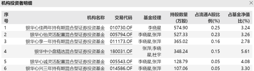 其次为银华基金、中欧基金和鹏华基金,这三家基金公司分别重仓该股2466.90万股、2356.27万股、2190.29万股,占其流通股的比例分别为1.05%、1.01%、0.93%。