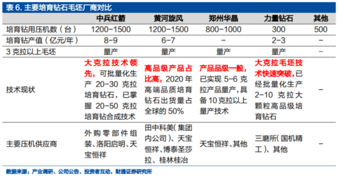 据研报梳理,主要培育钻石毛坯厂商涉及中兵红箭、黄河旋风和力量钻石这三家上市公司。