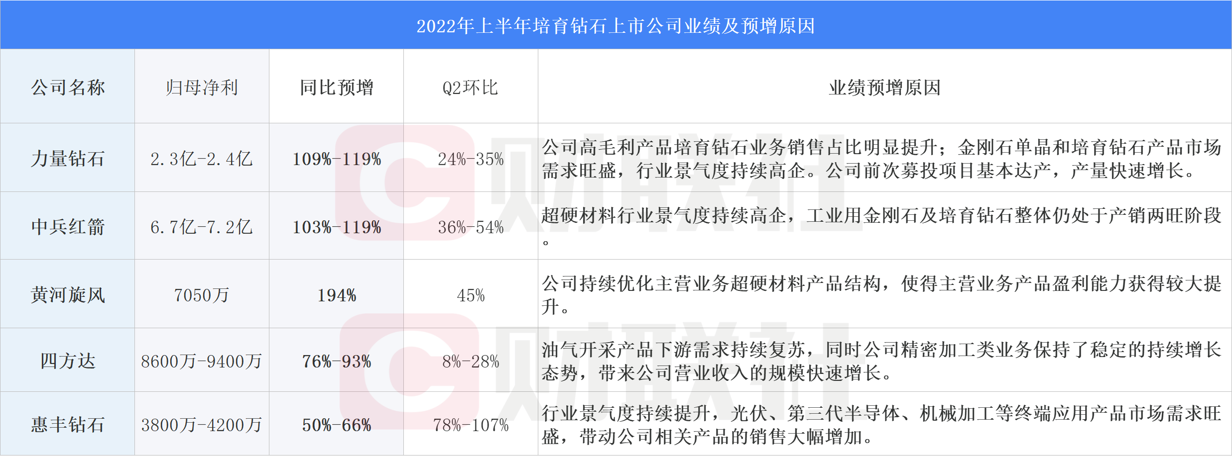 多家培育钻石上市公司近期晒出2022年上半年“成绩单”。据财联社不完全统计,目前已披露半年度业绩预告的A股公司中,黄河旋风同比大增近2倍领跑,力量钻石和中兵红箭净利增幅预计翻倍。二季度净利环比增幅方面,惠丰钻石最高预计翻倍,排名第一;四方达预增幅度最小,但仍为正值。