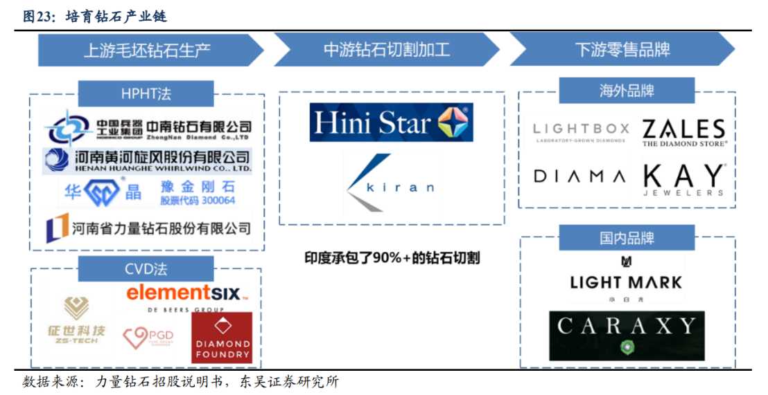 东吴证券分析师吴劲草6月20日发布的研报中表示,我国培育钻石上游毛坯钻石大规模生产技术已经比较成熟,形成产业集群优势;中游90%+的钻石切割加工均在印度,下游品牌端主要以传统钻石珠宝品牌旗下的培育钻石为主。