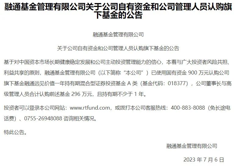 具体而言,7月6日,融通基金公告称,基于对中国资本市场长期健康稳定发展和公司主动投资管理能力的信心,融通基金已使用固有资金900万元认购公司旗下基金融通远见价值一年持有期混合A类,公司董事长与高级管理人员合计认购前述基金296万元,且持有期不少于1年。
