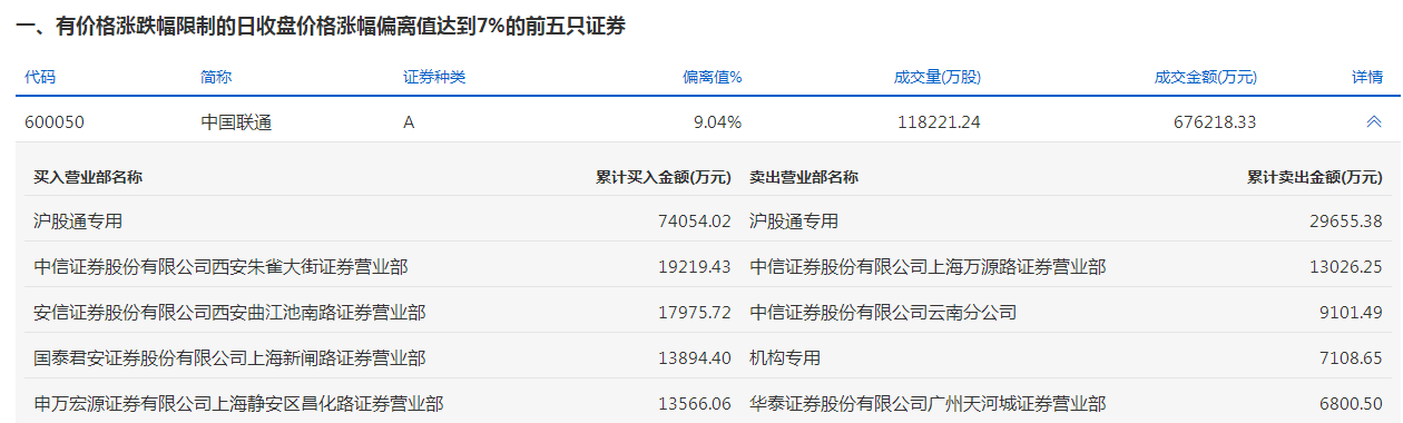 中国联通今天涨停。盘后数据显示,1个机构出现在龙虎榜单上,净卖出约7108.65万元;沪股通专用席位买入7.41亿元,同时卖出2.97亿元;中信证券股份有限公司西安朱雀大街证券营业部买入1.92亿元;华泰证券股份有限公司广州天河城证券营业部卖出6800.5万元。