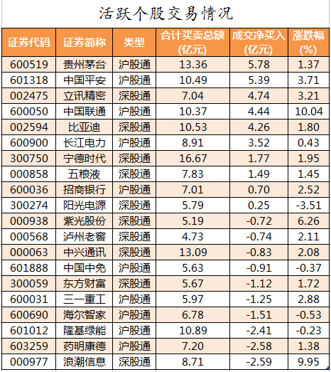 活跃个股方面,北向资金今日净买入较多的有贵州茅台、中国平安、立讯精密、中国联通、比亚迪,净买入金额分别为5.78亿元、5.39亿元、4.74亿元、4.44亿元、4.26亿元。北向资金净卖出较多的有浪潮信息、药明康德、隆基绿能、海尔智家、三一重工,净卖出金额分别为2.59亿元、2.58亿元、2.41亿元、1.51亿元、1.25亿元。