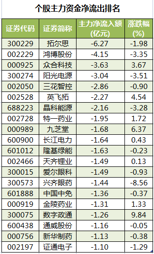 此外,2751只个股被主力资金净卖出,其中,23股被主力资金净卖出超1亿元。主力资金净流出最多的个股是拓尔思,净流出金额为6.27亿元;主力资金净流出居前的个股还有鸿博股份、众合科技、阳光电源、三花智控、英飞拓,净流出金额分别为4.15亿元、3.63亿元、3.04亿元、2.86亿元、2.27亿元。
