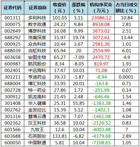 盘后龙虎榜数据显示,今日机构席位资金合计净买入约2.43亿元。其中,净买入的个股9只,净卖出的个股11只。机构净买入最多的股票是多利科技,净买入金额约2.31亿元;机构净买入居前的还有数字政通、博彦科技、浩瀚深度等股。机构净卖出最多的股票是中国联通,净卖出金额约7108.65万元;机构净卖出居前的还有石英股份、九牧王、汉王科技等股。