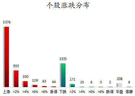 截至收盘,沪深两市合计3376只个股上涨,1335只个股下跌,平盘个股208只,停牌的个股8只。不含当日上市新股,共有44只个股涨停,2只个股跌停。连续涨停天数看,*ST瑞德已连收11个涨停板,连续涨停板数量最多。