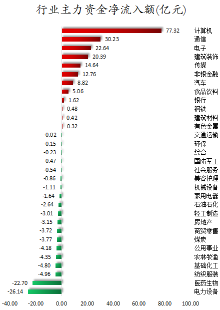 从行业板块来看,申万所属的31个一级行业,今日有12个行业板块主力资金呈现净流入,其中,计算机行业板块主力资金净流入最多,净流入金额为77.32亿元;行业板块主力资金净流入居前的还有通信、电子、建筑装饰、净流入金额分别为30.23亿元、22.64亿元、20.39亿元。19个行业板块主力资金呈现净流出,其中,电力设备行业板块主力资金净流出最多,净流出金额为26.14亿元;行业板块主力资金净流出靠前的还有医药生物、纺织服装、基础化工、农林牧渔、公用事业,净流出金额分别为22.7亿元、4.96亿元、4.8亿元、4.35亿元、4.18亿元。